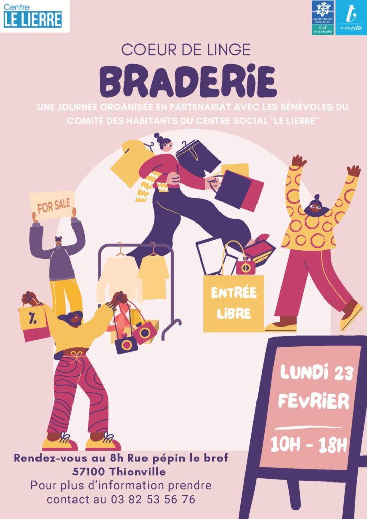 Le lundi 23 février 2026, de 10h à 18h, les bénévoles du comité des habitants du Centre Social « Le Lierre » vous donnent rendez-vous pour une grande braderie solidaire au 8 rue Pépin Le Bref à Thionville. L’événement, organisé au sein de la boutique solidaire Cœur de Linge, promet une journée conviviale où chacun pourra dénicher des vêtements et accessoires à petits prix, tout en participant à une démarche solidaire et engagée pour la vie du quartier.